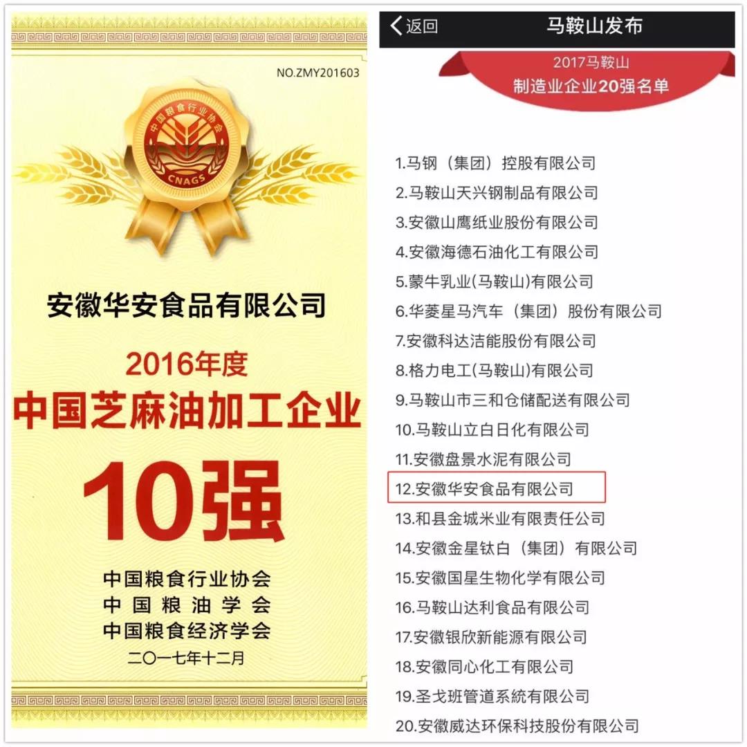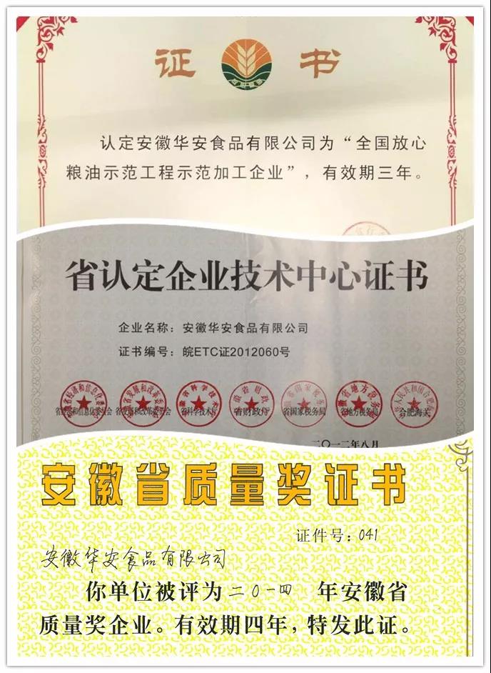華安公司是國家級放心糧油進農村進社區示範加工企業、全國芝麻油加工十強企業(第三名)、全國食用植物油加工50強(第40名)、安徽省農業産業化龍頭企業、省糧食行業排頭兵企業、省油脂十強企業、安徽省專精特新企業、安徽省技術創新示範企業、省先進中小企業,並(bìng)榮獲安徽省質量獎稱号。其主導産品“老榨坊”、“雞籠山”、“家壹味”牌系列芝麻油採(cǎi)用傳統工藝與現代技術相結合制成,是安徽省名牌産品、綠色食品,安徽省著名商标。同時是第二批全國“放心油”和首批安徽省“放心油”,是江蘇省無錫市糧油行業唯一的“重點保護産品”。該品牌還榮獲“安徽省産品質量獎”稱号。公司的“雞籠山”“老榨坊”系列産品被認定爲“上海市名優食品”、“上海市最受歡迎消費品”。